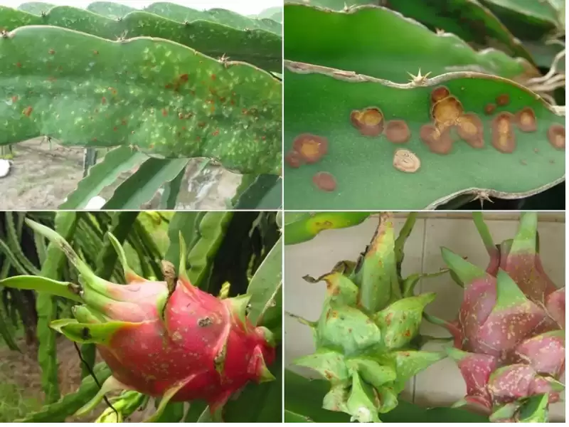 Bệnh thán thư thường phát triển mạnh khi thời tiết nóng ẩm và mưa nhiều, thông thường bệnh tấn công ở nhiều bộ phận khác nhau trên cây thanh long từ hoa, cành đến trái.